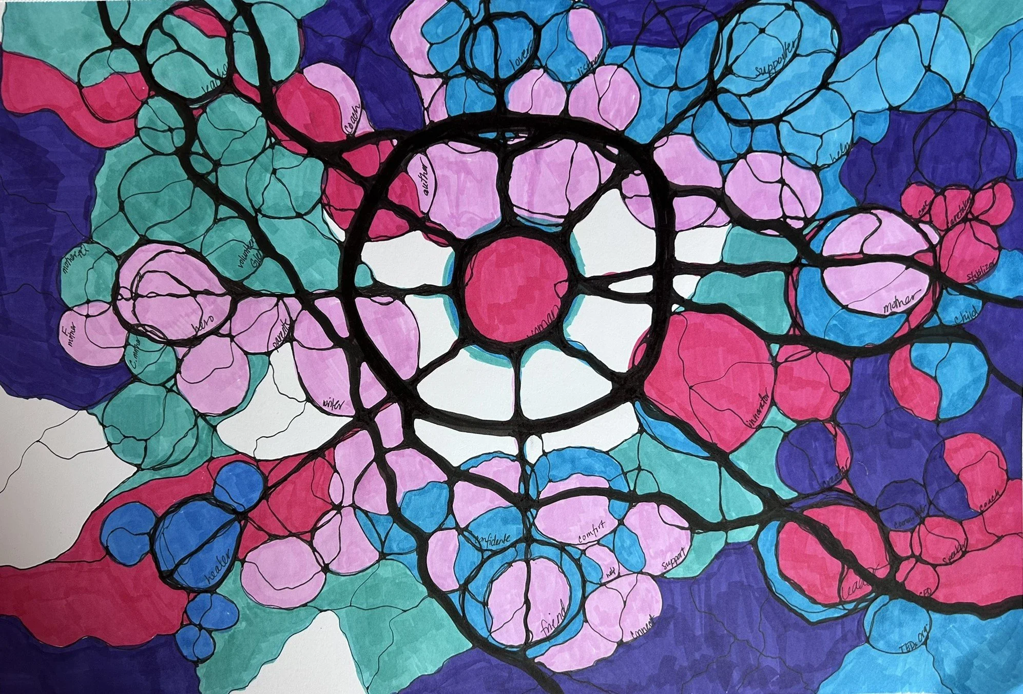You are guided through structured steps, starting with a topic you choose. Layers of lines, shapes, and colors are added during the process giving you various ways to connect to your thoughts.